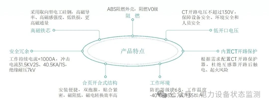取電互感器采用IP68級防水、鐵芯納米層防銹及V0級阻燃設(shè)計,內(nèi)置專業(yè)型開路保護器(保護啟動后電壓有效值Vrms<2V),大電流容量設(shè)計讓額定滿載電流時溫升≤35℃,保障了現(xiàn)場的安全便捷安裝及長期無憂的安全穩(wěn)定運行。